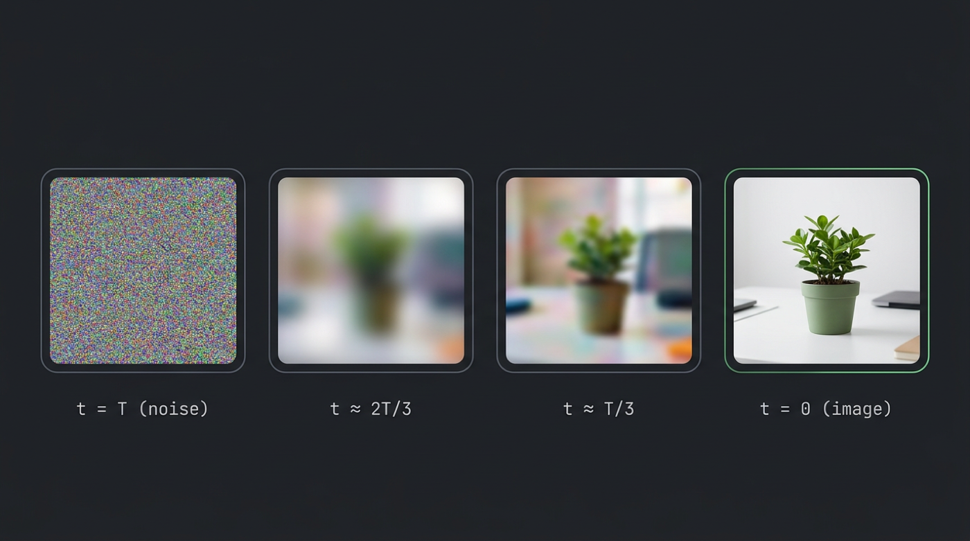 The figure below is illustrative—not an exact frame-by-frame trace of any one commercial scheduler—but it matches the user-facing idea: static noise → emerging structure → detail → a sharp image.