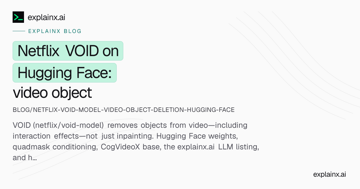 This article summarizes publicly posted materials on the VOID Hugging Face model card and related links. Netflix owns VOID; ExplainX is not affiliated with Netflix or BgBlur. Verify commands, VRAM needs, and license terms on the official pages before production use.