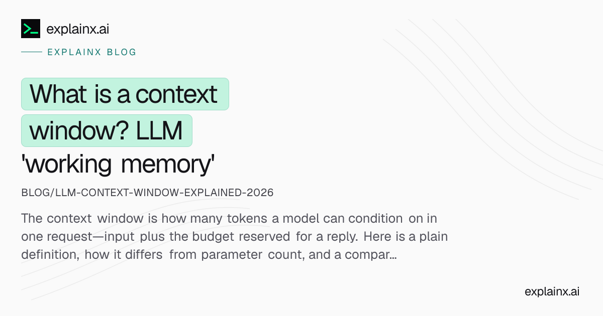 The context window (context length) is the token budget a single request can use: the full prompt you send (system text, user message, prior turns, tool definitions, retrievals, tool results) plus the space allowed for the new completion, up to a max output cap. It is a limit on how much the model can attend to at once, not the same as parameter count or how usage is metered in tokens—though all three appear on the same pricing pages.
